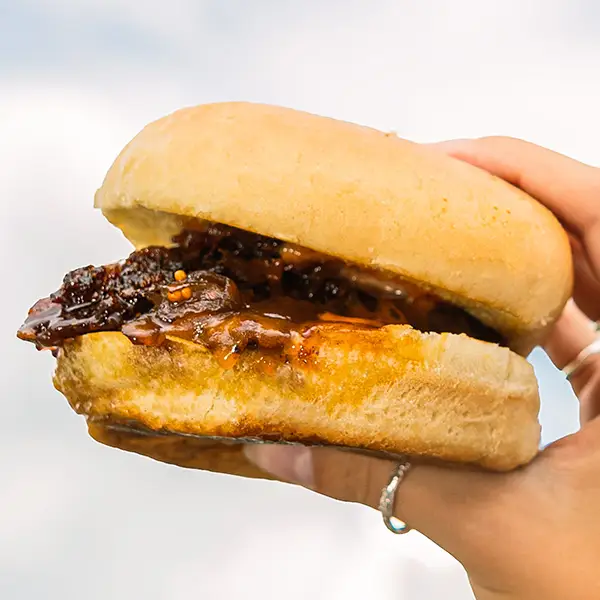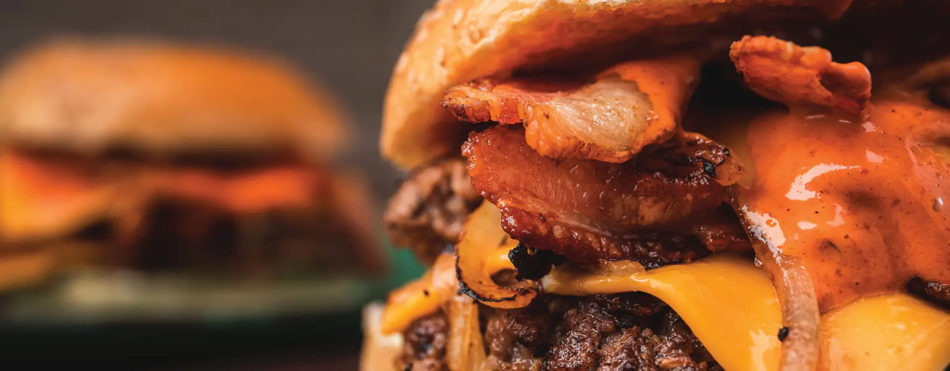 double smash burger, caramelized onions, American cheese, bacon jam, pickle relish, smash sauce, potato bun
